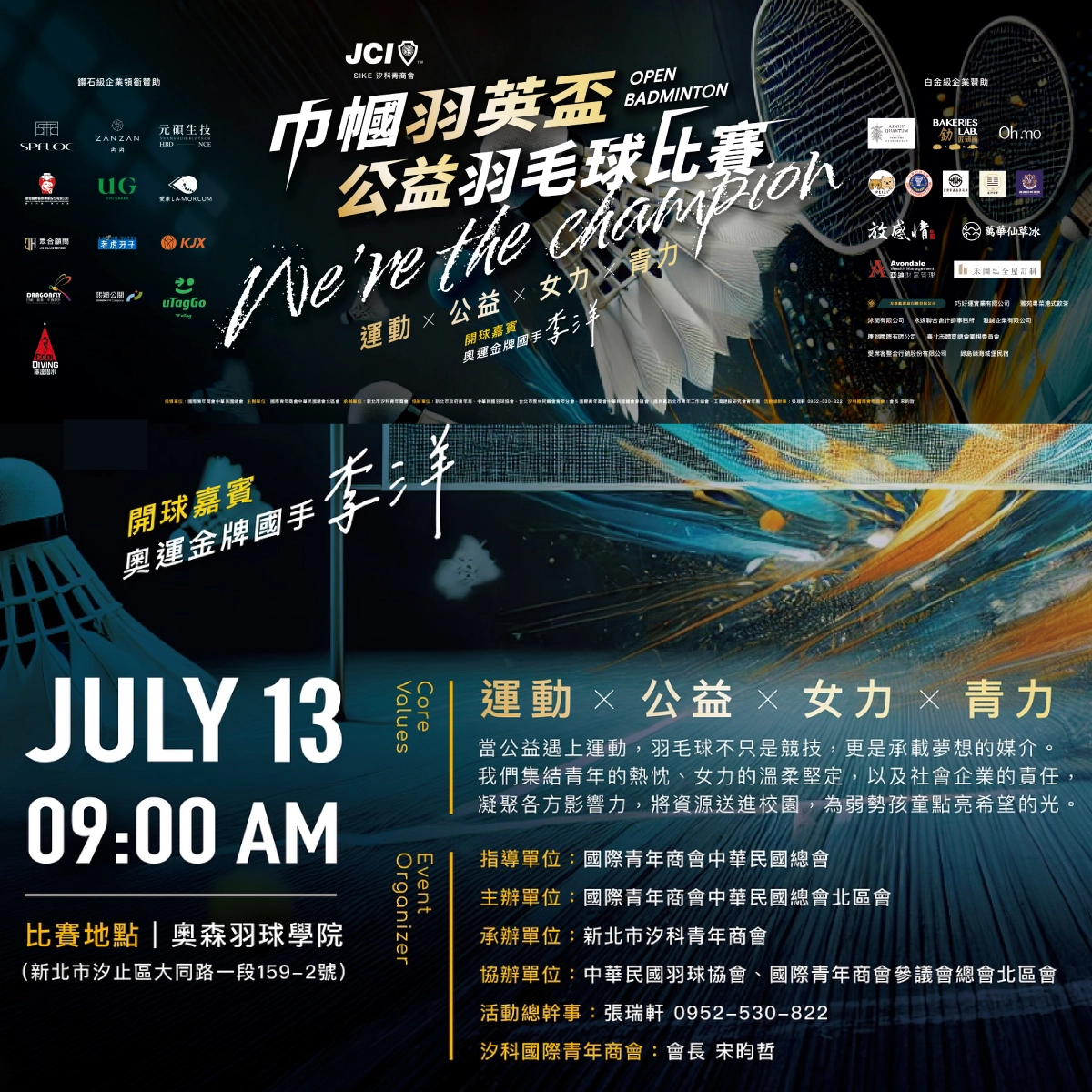 首屆「巾幗羽英盃」由JCI汐科國際青年商會宋昀哲、張瑞軒舉辦,將於7月13日(日)於新北市汐止區奧森羽球學院盛大舉辦,特別邀請奧運金牌得主李洋擔任開球大使,並將在活動現場小秀身手,分享他對關懷弱勢、投入愛心公益與推動運動的精神理念。主辦方表示,希望透過一場用球拍揮灑愛的公益羽毛球賽,讓羽球成為傳遞希望與夢想的媒介,連結青年的熱忱、女力的溫柔與堅定,以及企業的社會責任,共同凝聚影響力,將資源送進校園,為懷抱夢想的弱勢青年學子點亮未來道路。
